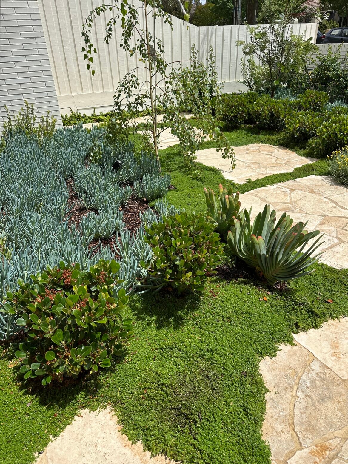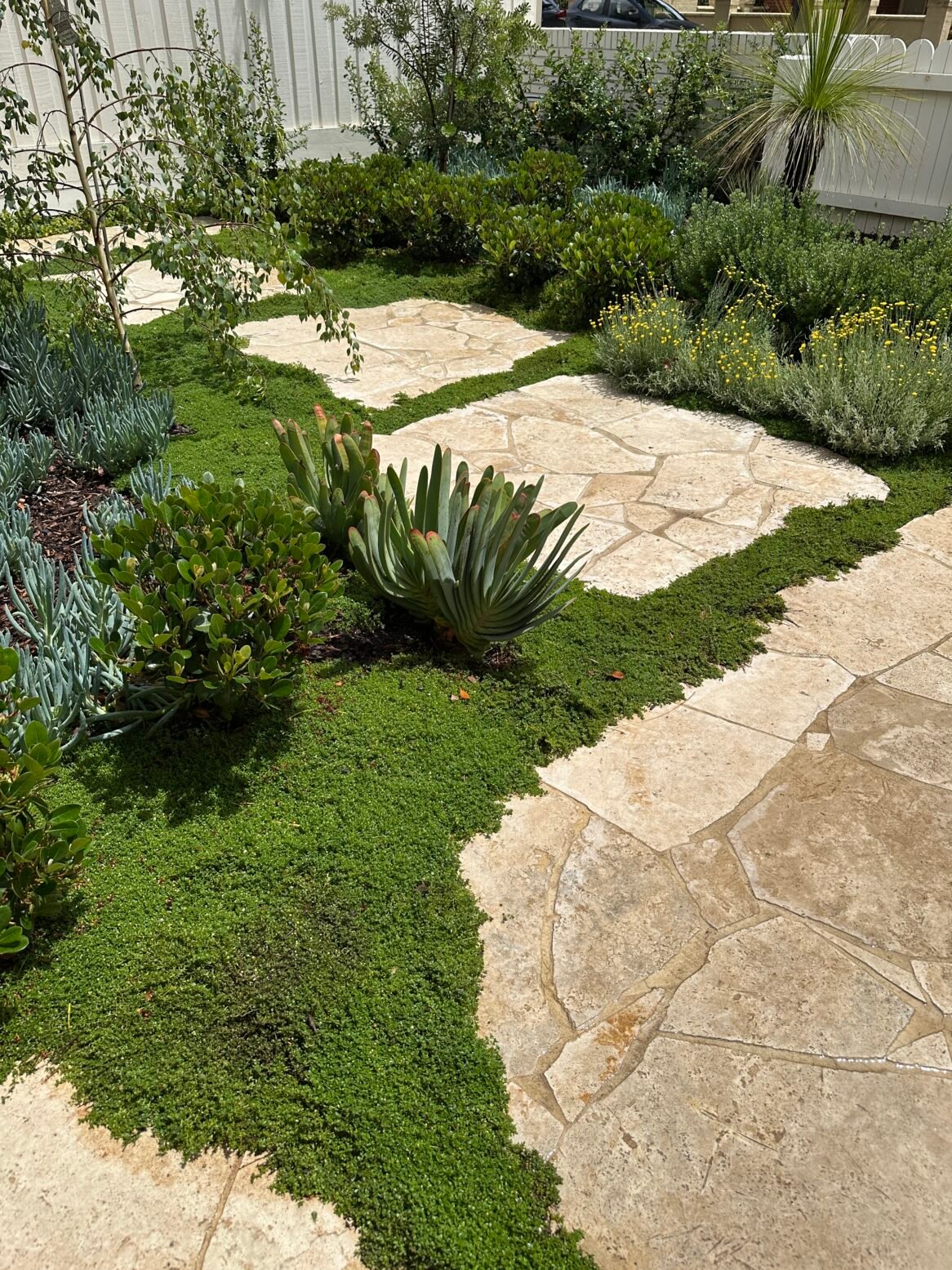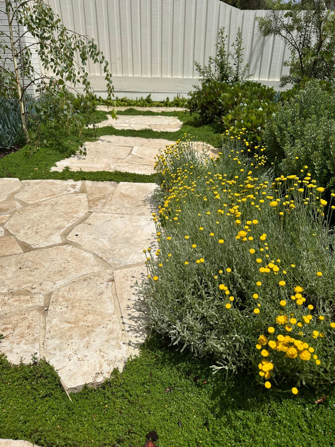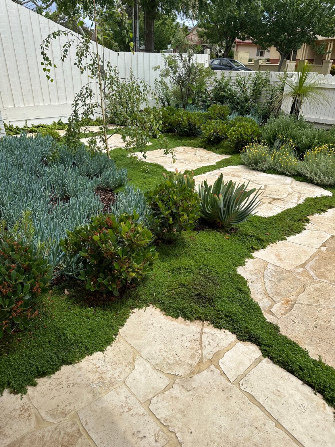 To introduce natural texture and functional flow, we installed stepper stone pavers — adding rustic charm and visual contrast while helping define informal pathways throughout the garden.