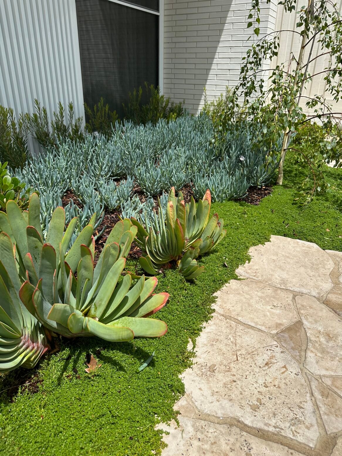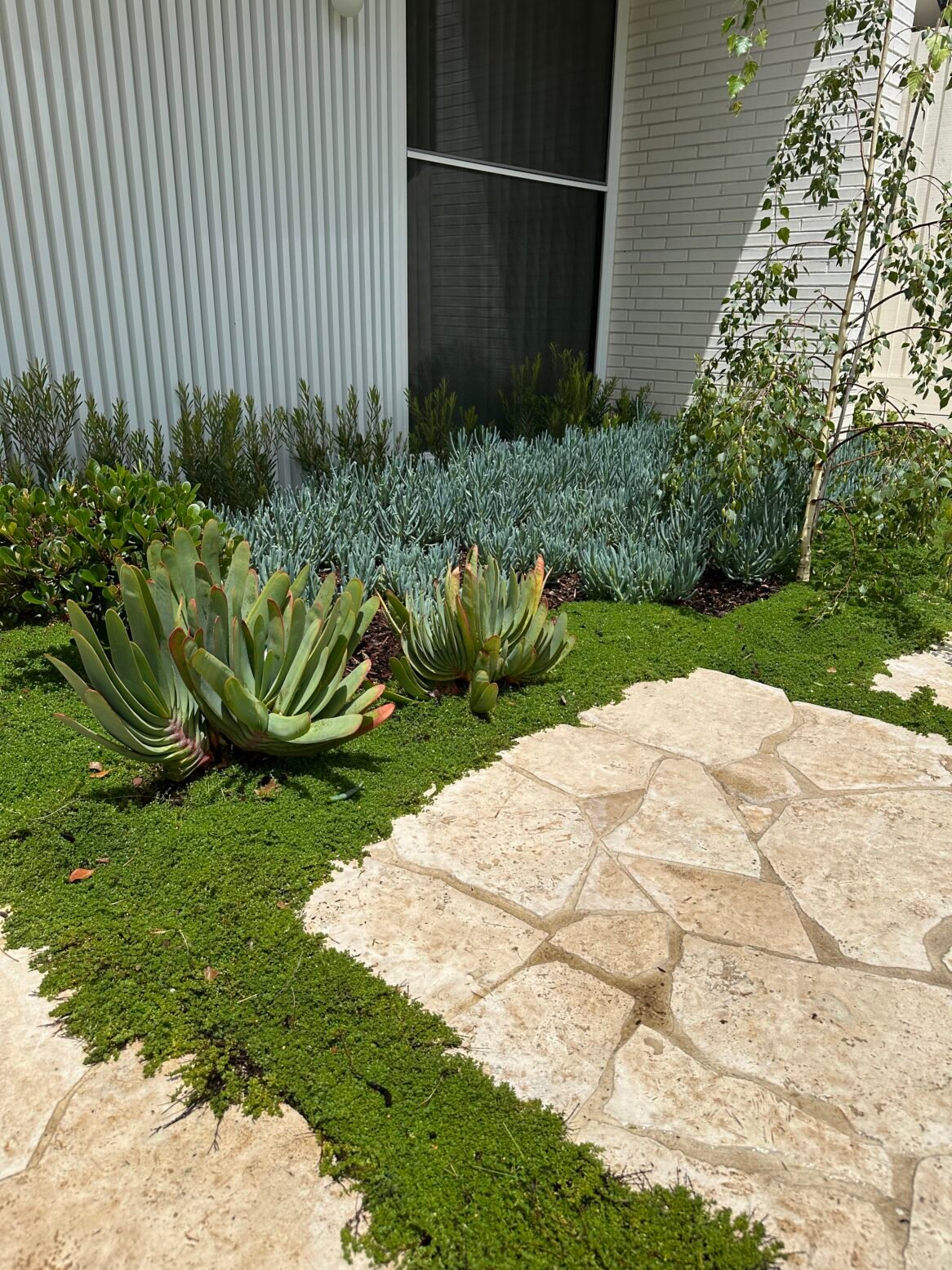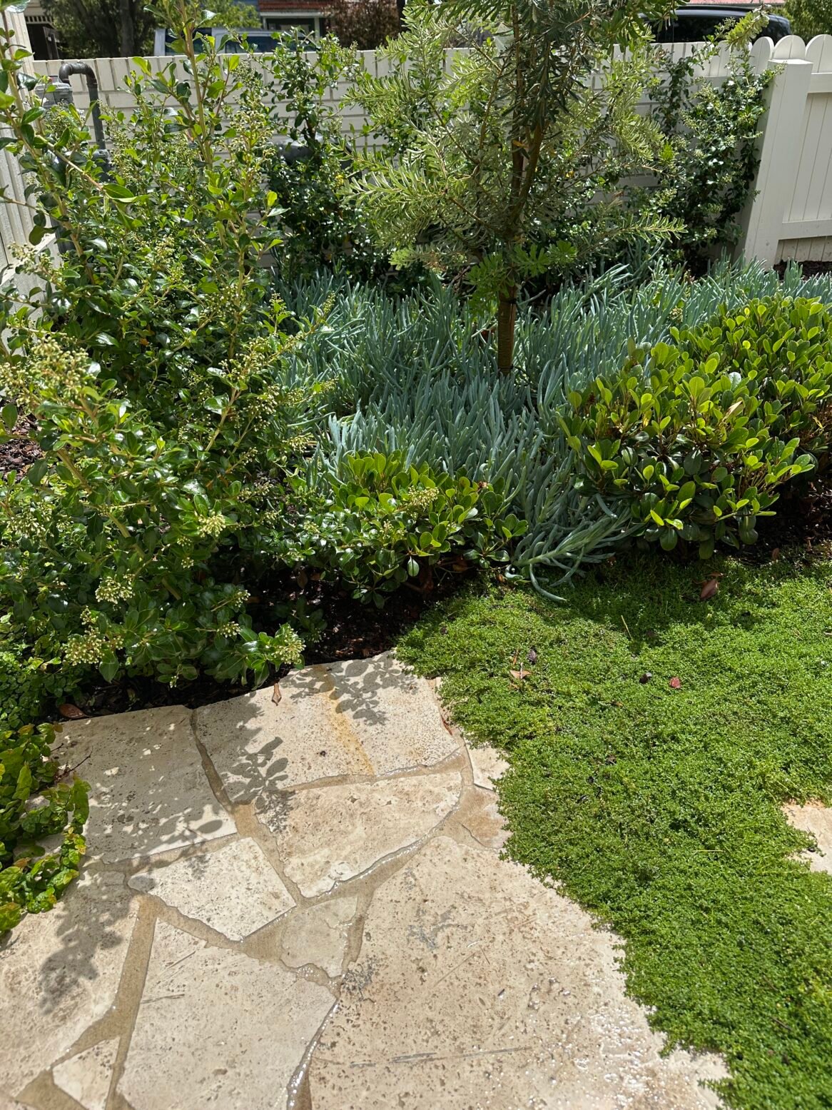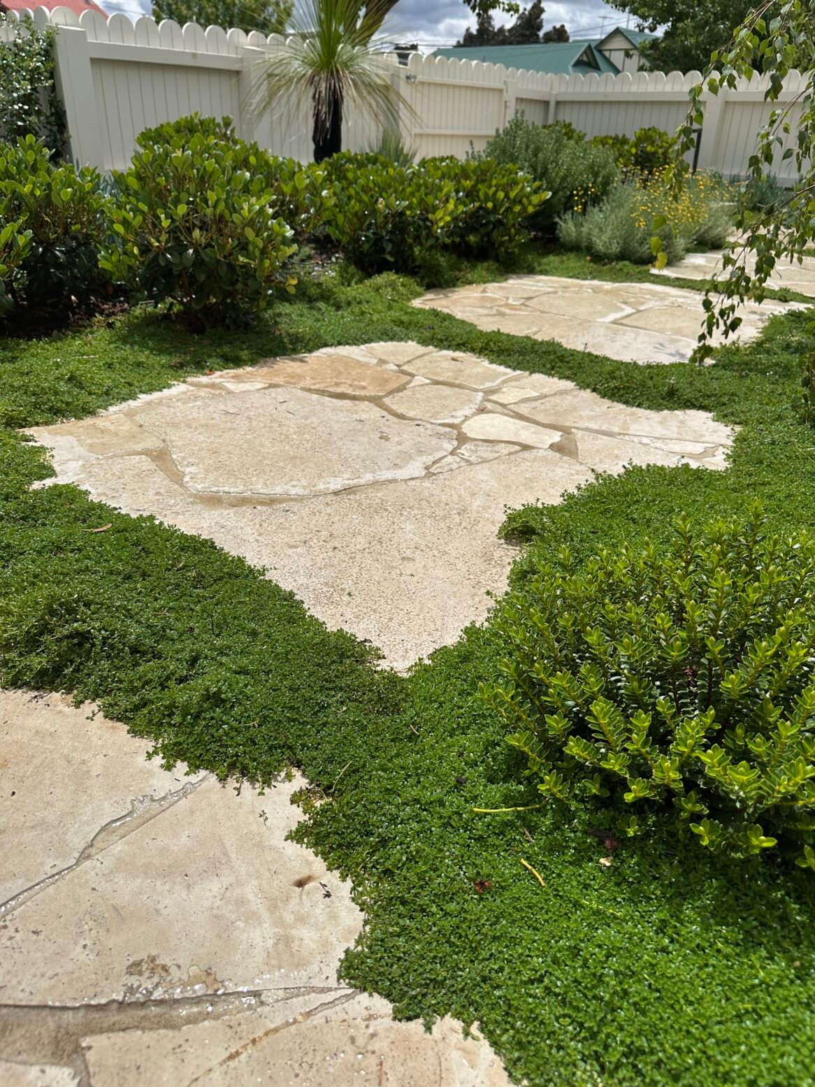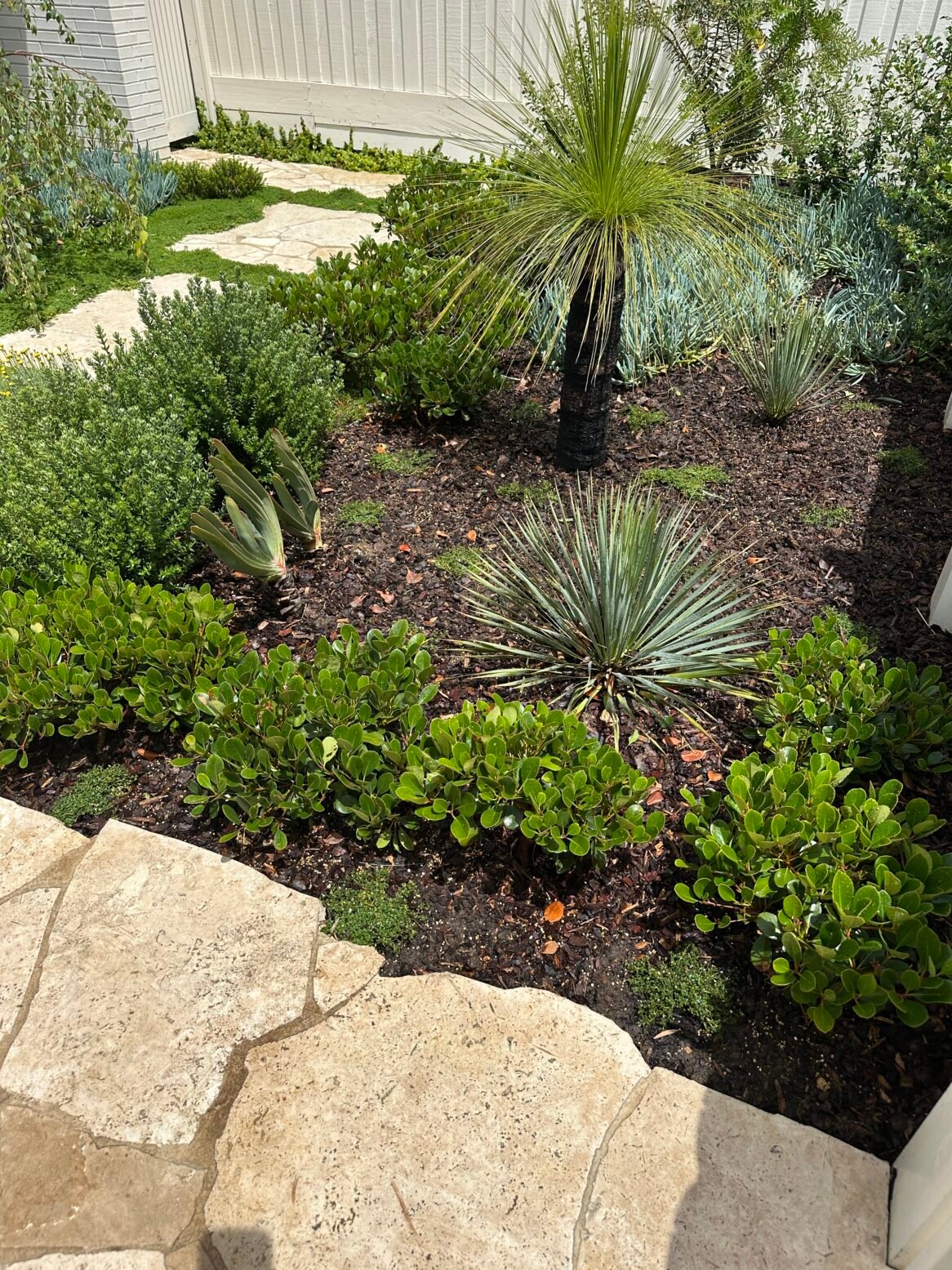 To introduce natural texture and functional flow, we installed stepper stone pavers — adding rustic charm and visual contrast while helping define informal pathways throughout the garden.